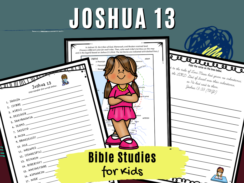 These fun activity pages will help children learn Joshua 13, when territory is given to the tribes of Reuben, Gad, and the half-tribe of Manasseh. They can be used as time-filler activities, Sunday School lessons, or for a family worship service based on Joshua 13. They can also be used for personal Bible study at home.