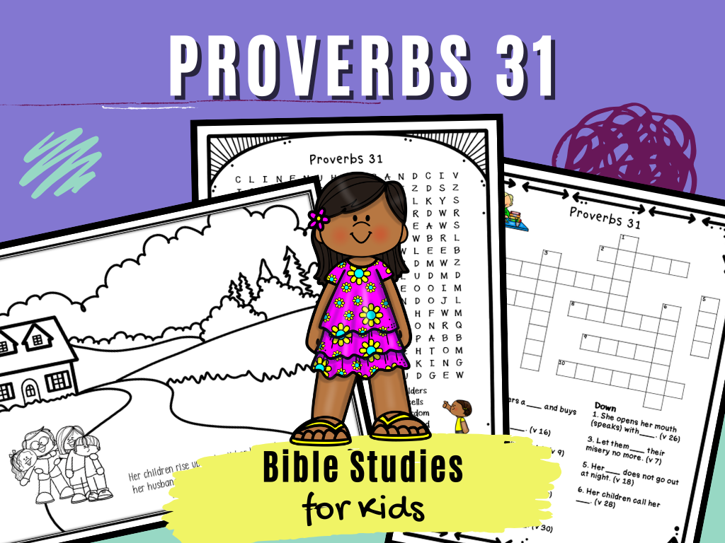 These fun activity pages will help children learn Proverbs 31, the words of King Lemuel that emphasizes important character qualities. This chapter also focuses on the “Proverbs 31 woman”, a virtuous woman of noble character. They can be used as time-filler activities, Sunday School lessons, or for a family worship service based on Proverbs 31. They can also be used for personal Bible study at home.