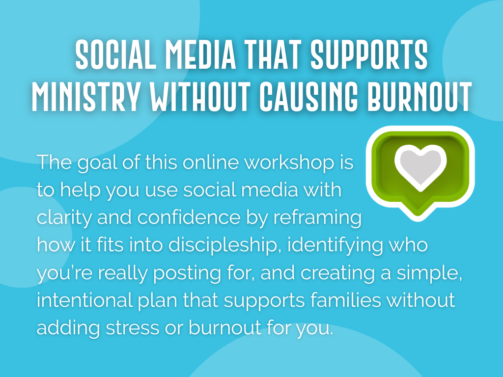 The goal of this online workshop is to help you use social media with clarity and confidence by reframing how it fits into discipleship, identifying who you’re really posting for, and creating a simple, intentional plan that supports families without adding stress or burnout for you.