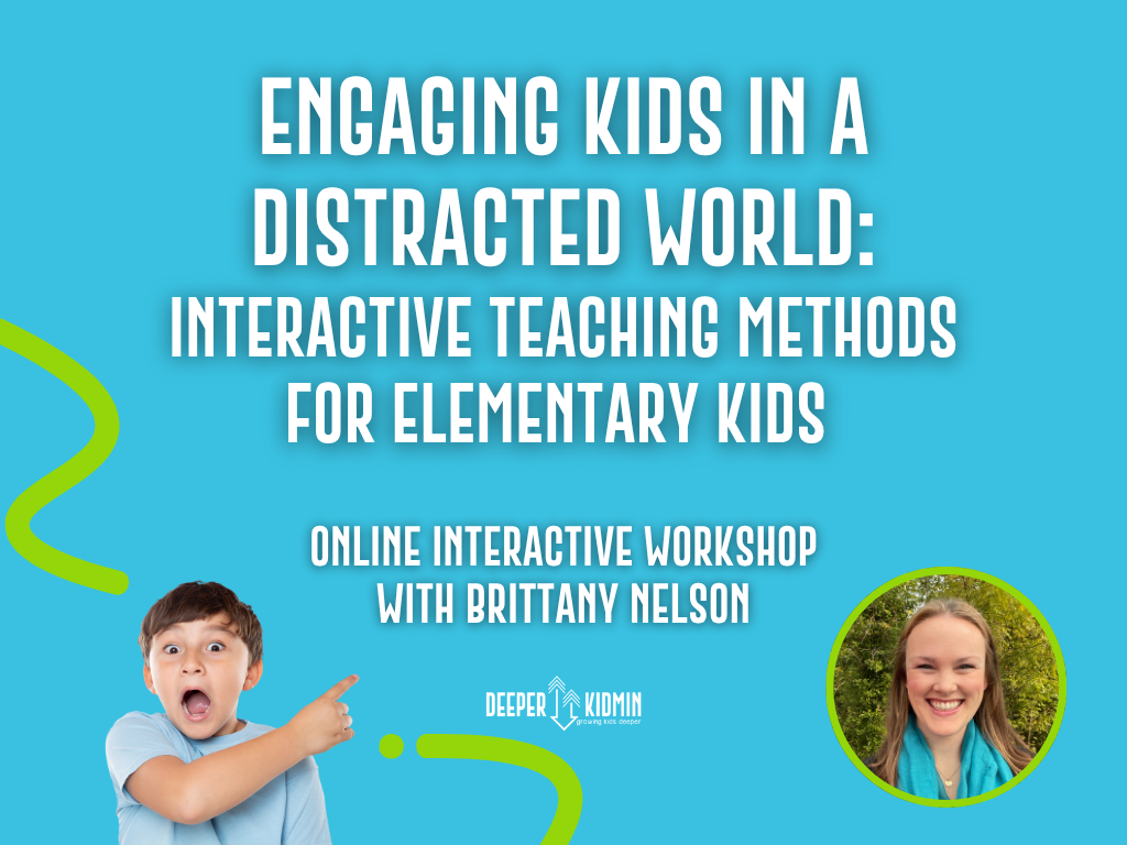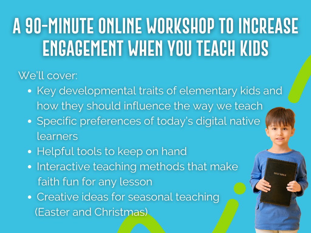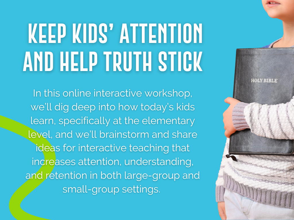 In this online interactive workshop, we will dig deep into how today’s kids learn, specifically at the elementary level, and we’ll brainstorm and share ideas for interactive teaching that increases attention, understanding, and retention in both large-group and small-group settings. We’ll explore and practice simple interactive teaching strategies that keep kids’ attention and help truth stick.