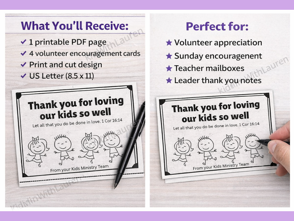 Encourage the amazing volunteers who serve in your kids ministry with these simple and meaningful printable encouragement cards. These cards are perfect for reminding your team that their faithfulness matters and that the work they do with children makes an eternal impact.