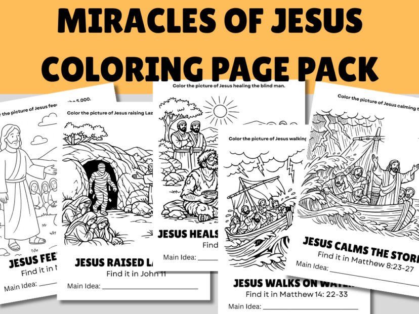 Help kids learn about the amazing miracles of Jesus with this printable coloring page pack. These Bible story coloring pages are perfect for Sunday School, kids church, early-arriver activities, or when the service runs long!