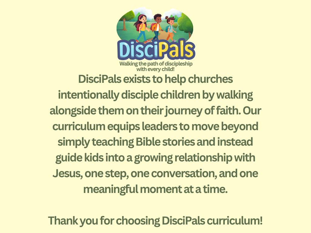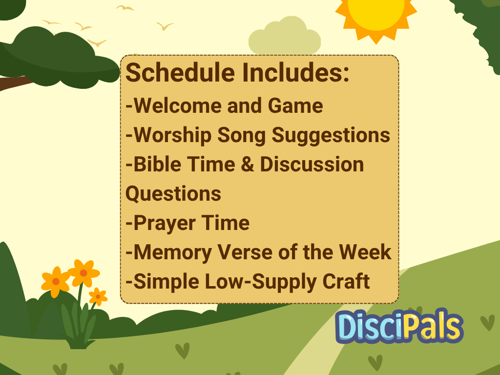 DisciPals curriculum includes a low-supply-need game, worship suggestions, a scripted Bible time/Bible Story, Memory Verse of the Week (MVOTW), and a low-supply craft idea. This is designed to be an easy-to-use “plug-and-play” format lesson.