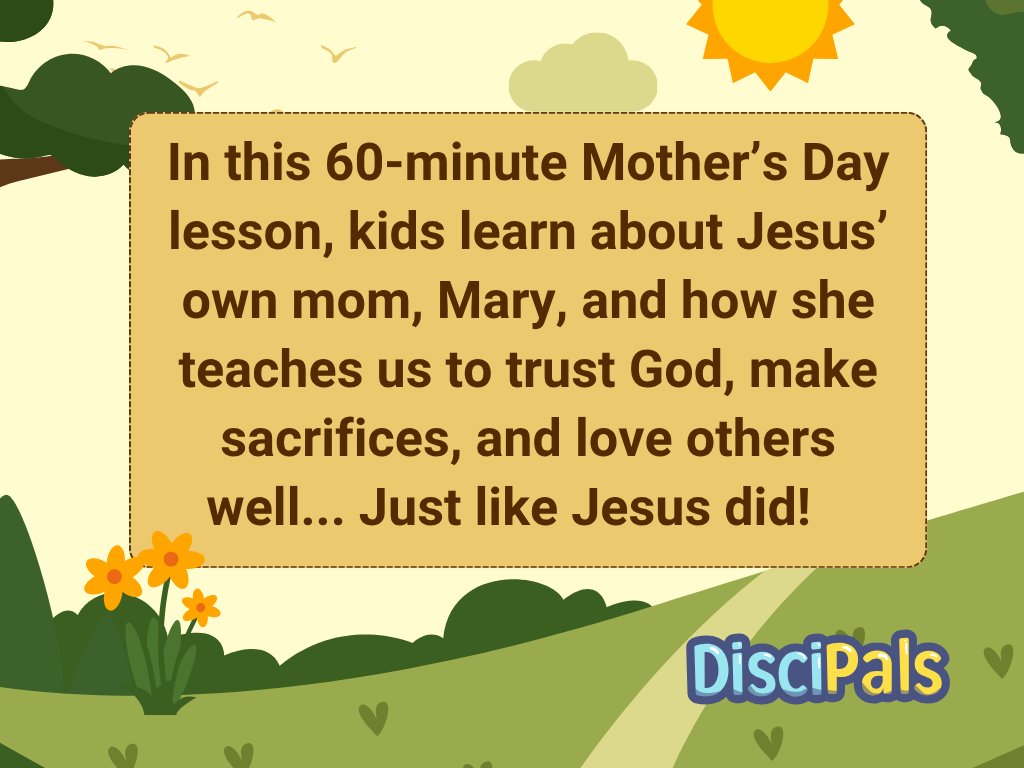 In this 60-minute Mother’s Day lesson, kids learn about Jesus’ own mom, Mary, and how she teaches us to trust God, make sacrifices, and love others well… Just like Jesus did!