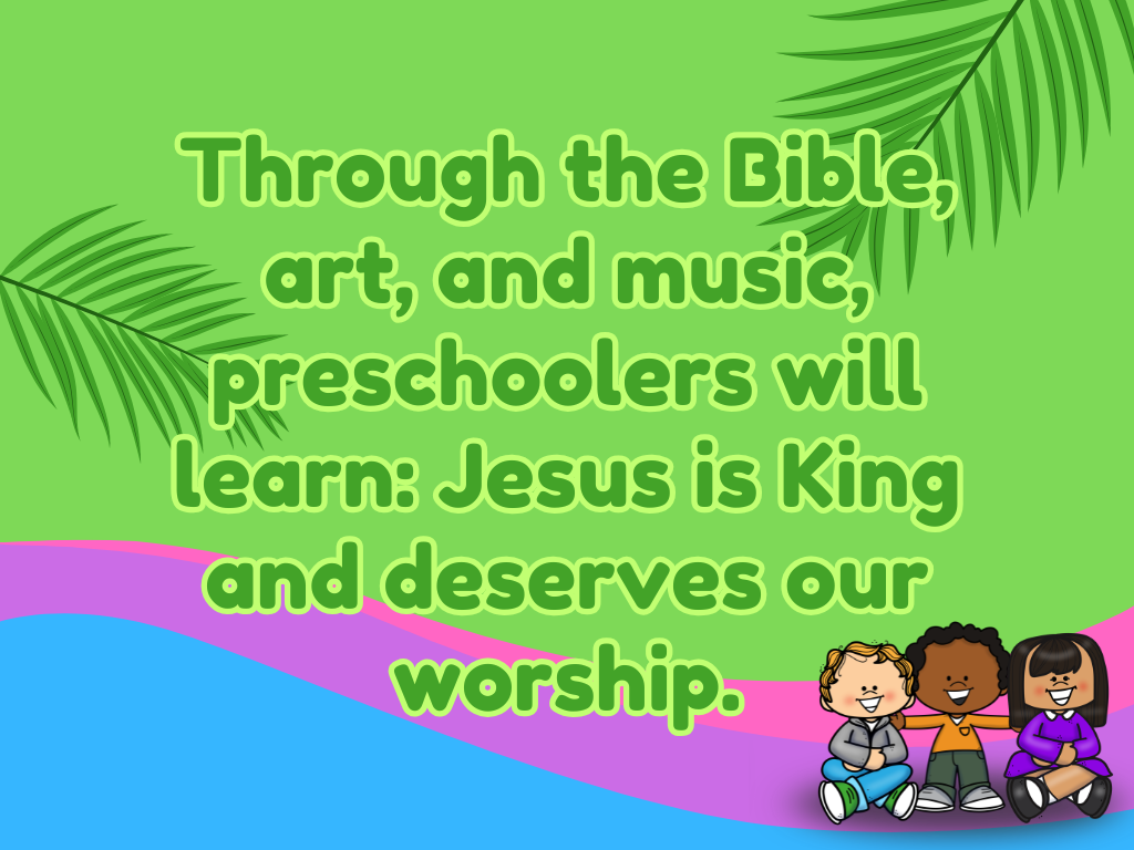 Through the Bible, art, and music, preschoolers will learn: Jesus is King and deserves our worship. This 60-minute lesson for preschoolers includes free play, interactive lesson, craft, and simple music to reinforce the main idea.Â