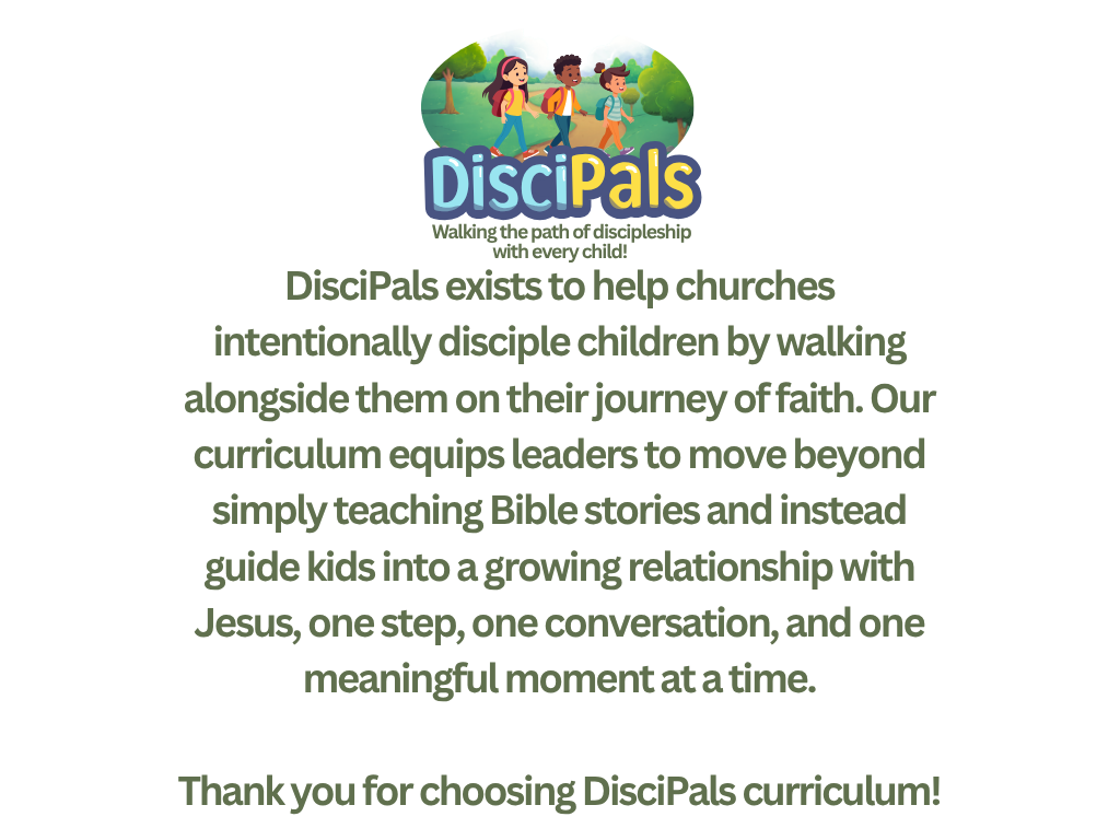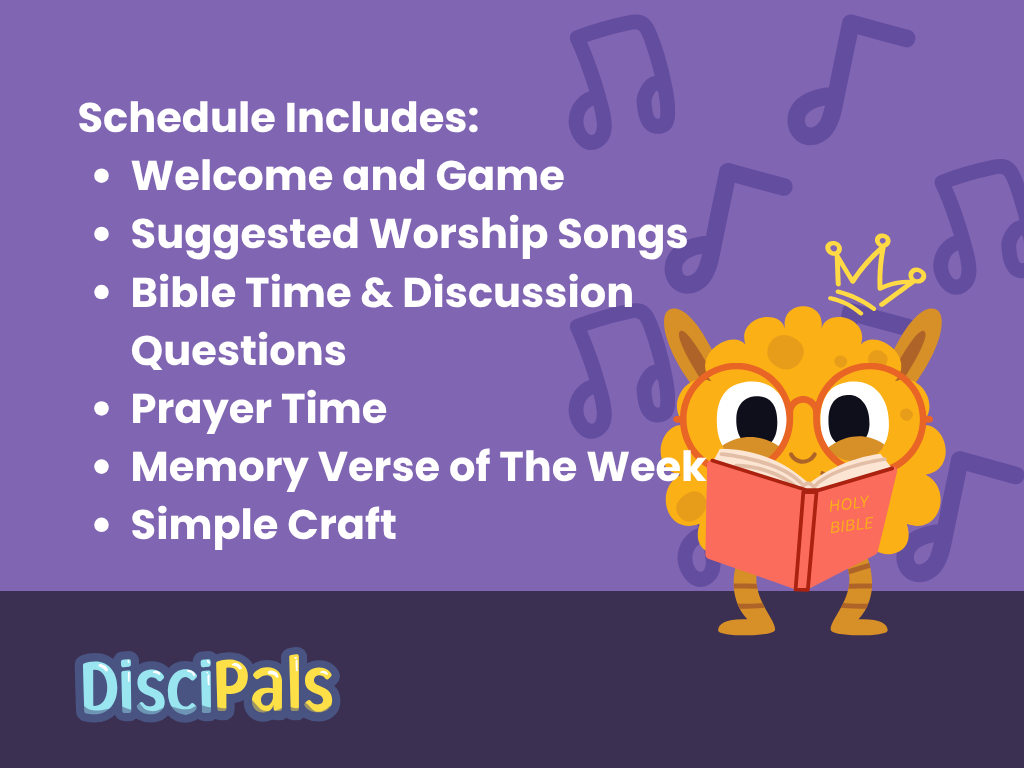 DisciPals curriculum includes a low-supply-need game, worship suggestions, a scripted Bible time/Bible Story, Memory Verse of the Week (MVOTW), and a low-supply craft idea. This is designed to be an easy-to-use “plug-and-play” format lesson.