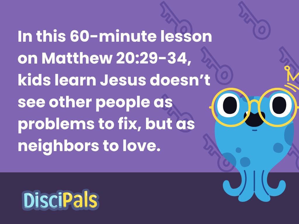 In this 60-minute lesson, kids learn about Matthew 20:29-34 and about how Jesus didn’t see other people as problems to fix… He saw them as neighbors to love! When we have the Holy Spirit in us, we start to see people that way too – the way Jesus did!