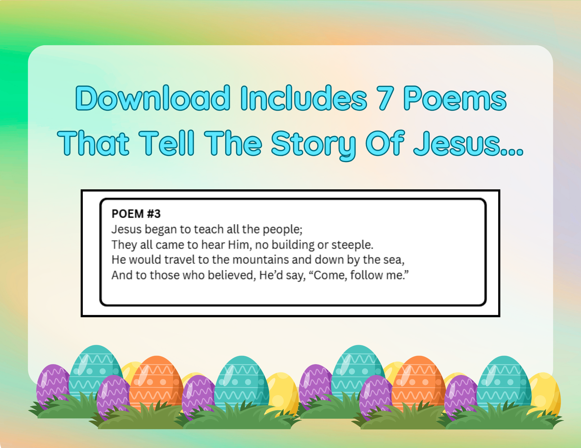 This resource is designed to bring the story of Jesus to life in a fun, memorable way. It includes seven poems that share the amazing story of Jesus and His sacrifice for us! The poems are hidden inside seven eggs during your egg hunt, allowing children to engage with the biblical narrative through active play.