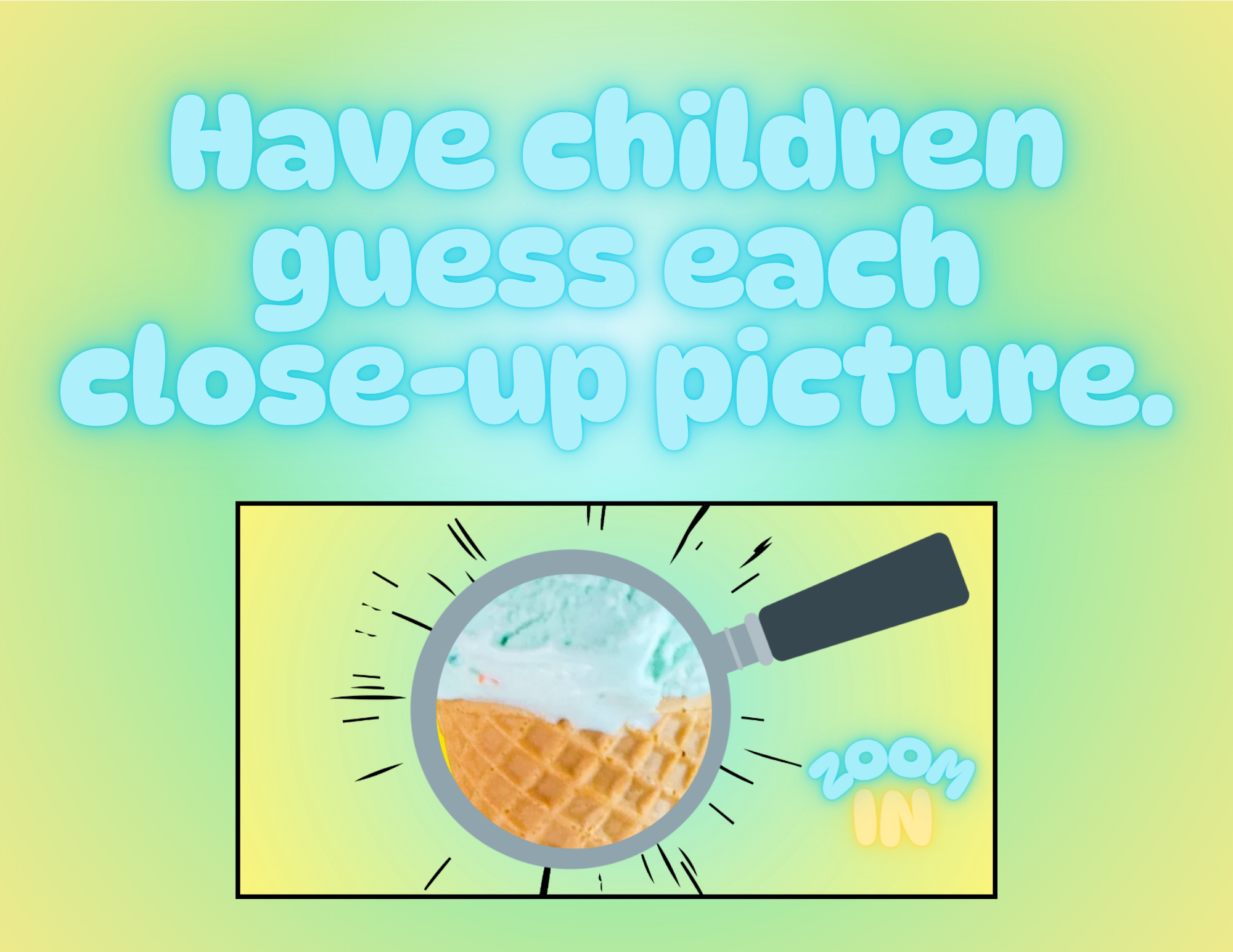 Invite children to put their magnifying glass skills to the test to see if they can guess what each picture is, even when looking at it up close. After children shout out their guesses, reveal the full-sized picture. You can play this game as a large group or split the children up into teams.